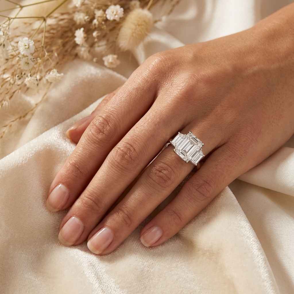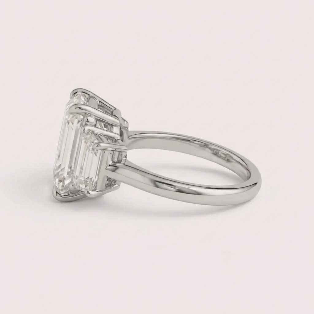 4.05ct Emerald Cut Lab Grown Diamond Three Stone Engagement Ring with Trapezoid Side Stones in 10K/14K/18K Gold – IGI Certified