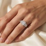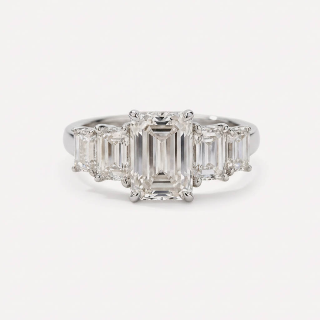 The step-cut diamonds create a refined hall-of-mirrors effect, beautifully showcased in a classic four-prong setting with a smooth, polished band. The side-stone layout enhances finger coverage while maintaining a sophisticated, minimal aesthetic—perfect for engagements, anniversaries, or milestone gifts.