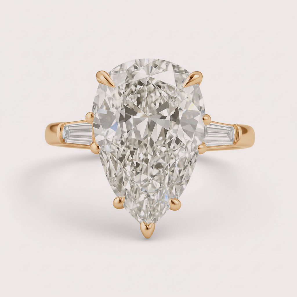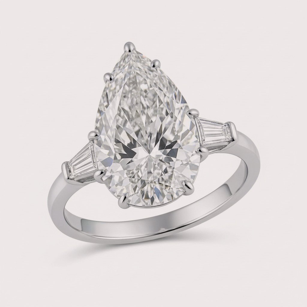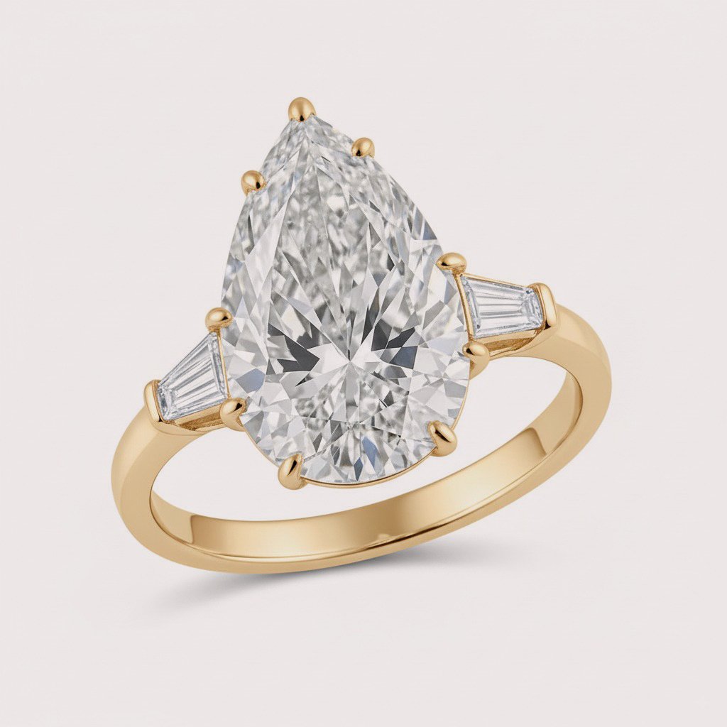 A graceful blend of classic and modern elegance, this 4.98ct Pear Cut Lab-Grown Diamond Engagement Ring is flanked by tapered baguette side stones for a refined three-stone setting. Crafted in 10K, 14K, or 18K gold (white, yellow, or rose), the elongated pear shape sparkles with depth, while the baguettes add vintage-inspired sophistication. IGI certified and made from ethical, sustainable lab-grown CVD diamonds, this ring is the perfect symbol of lasting love.