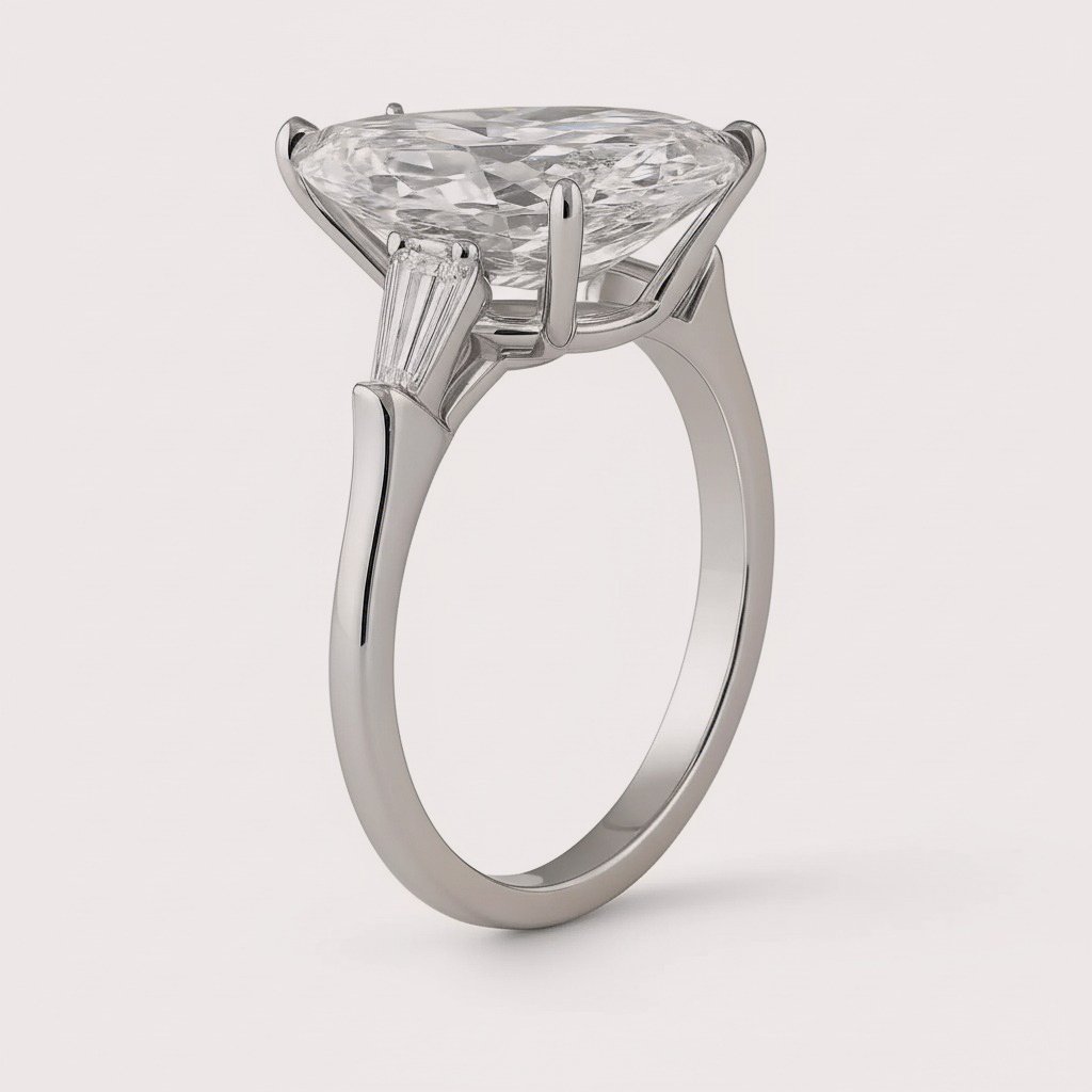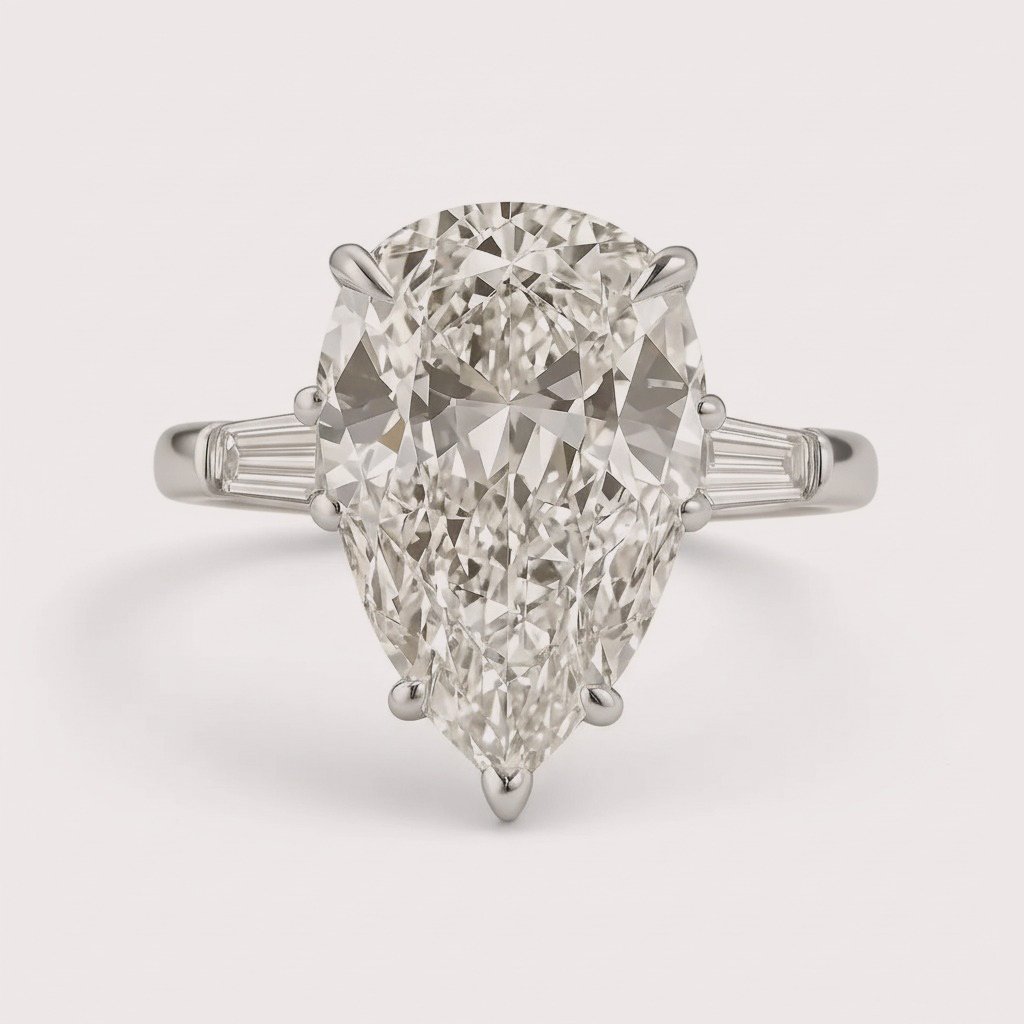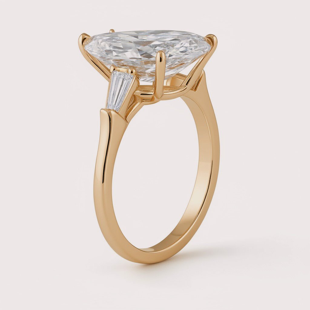 A graceful blend of classic and modern elegance, this 4.98ct Pear Cut Lab-Grown Diamond Engagement Ring is flanked by tapered baguette side stones for a refined three-stone setting. Crafted in 10K, 14K, or 18K gold (white, yellow, or rose), the elongated pear shape sparkles with depth, while the baguettes add vintage-inspired sophistication. IGI certified and made from ethical, sustainable lab-grown CVD diamonds, this ring is the perfect symbol of lasting love.