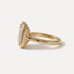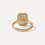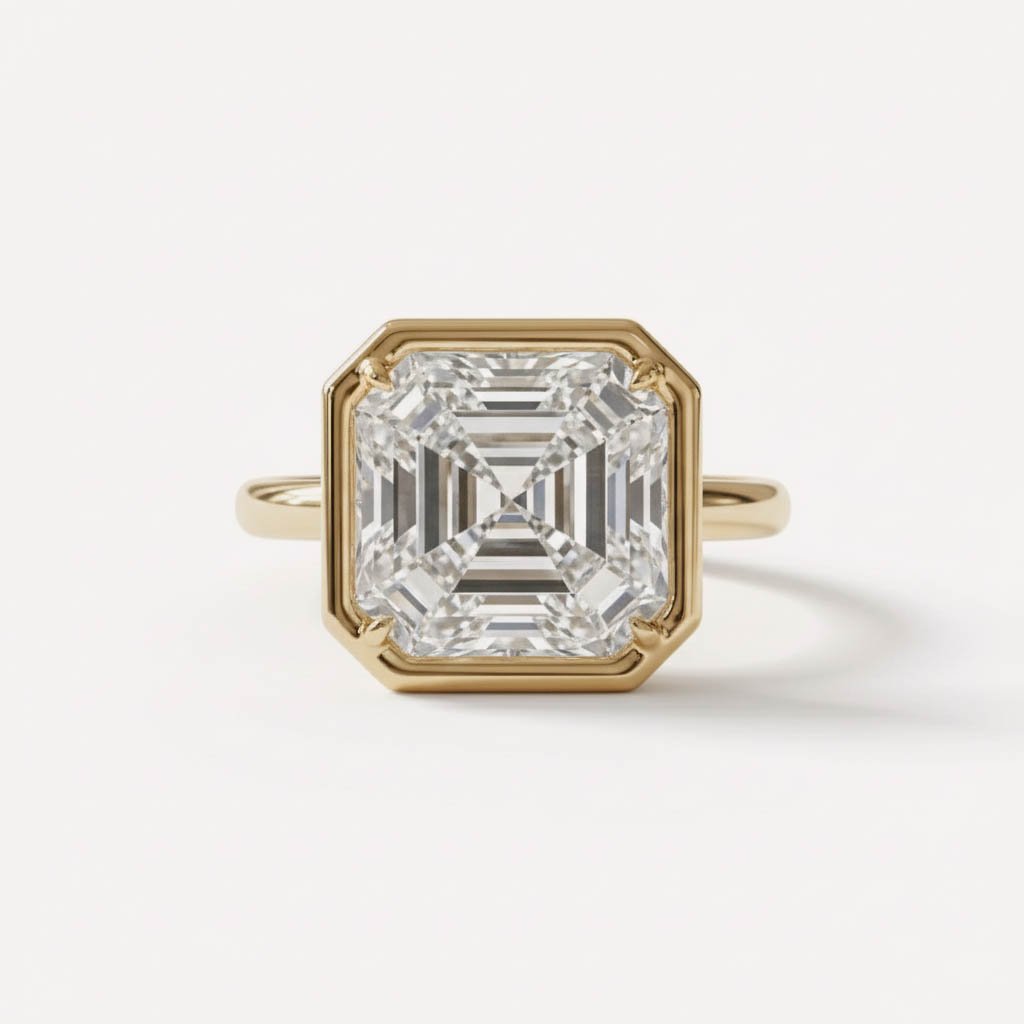 The stunning 5-carat Asscher cut, celebrated for its “hall of mirrors” geometric facets, is secured in a unique, custom-stepped bezel setting. This polished gold frame not only protects the diamond but also adds to its grand, architectural aesthetic.
