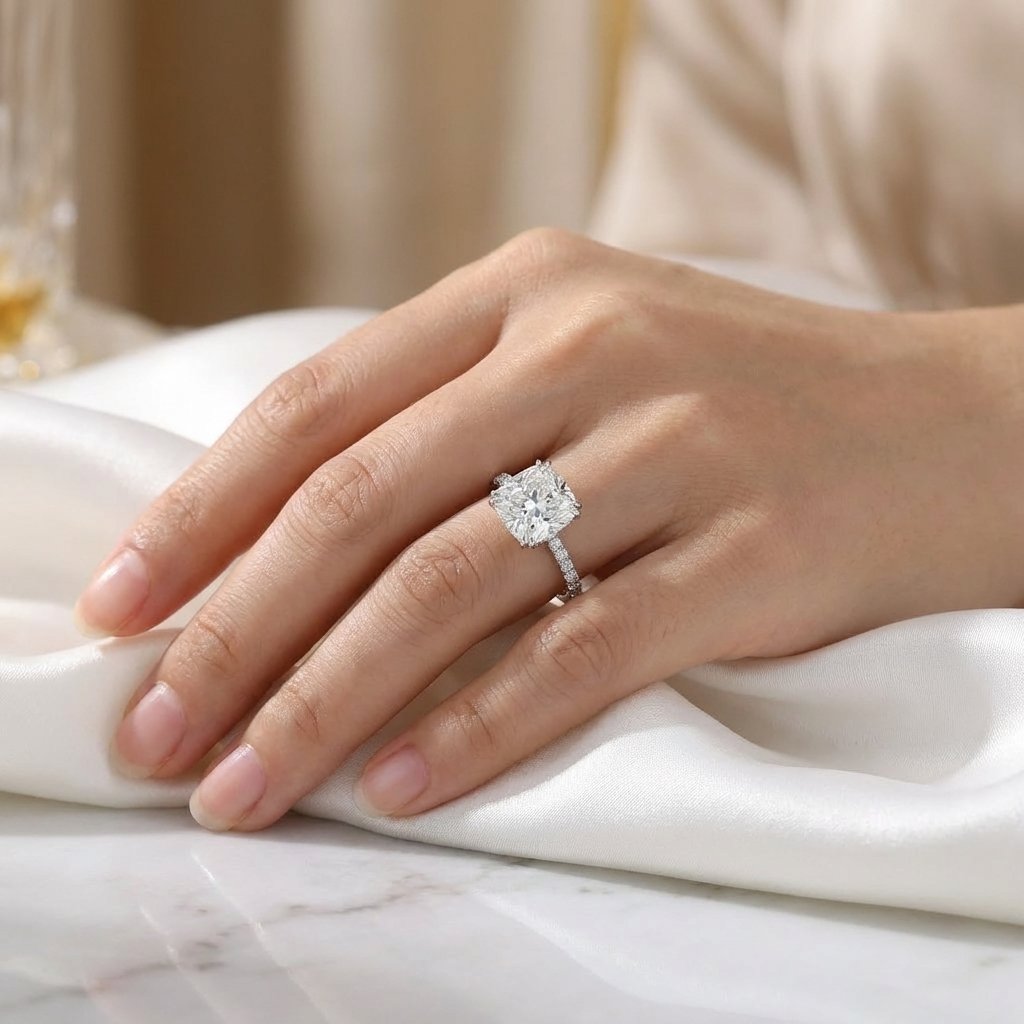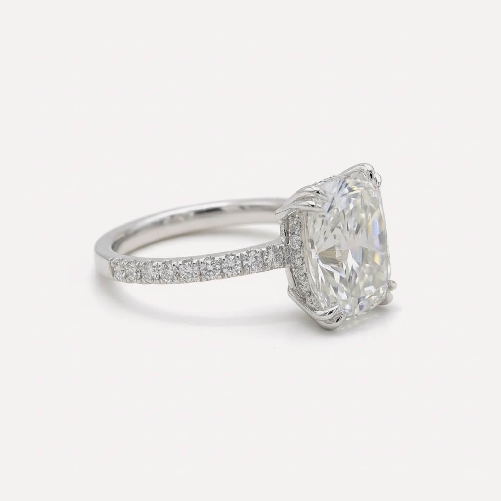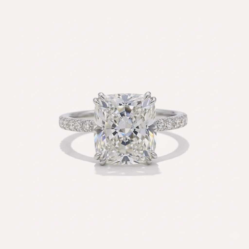 Make a bold and unforgettable statement with this 5.25 CT cushion cut lab grown diamond engagement ring, designed for exceptional brilliance and timeless luxury.