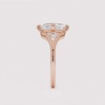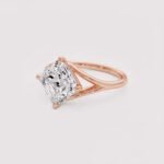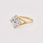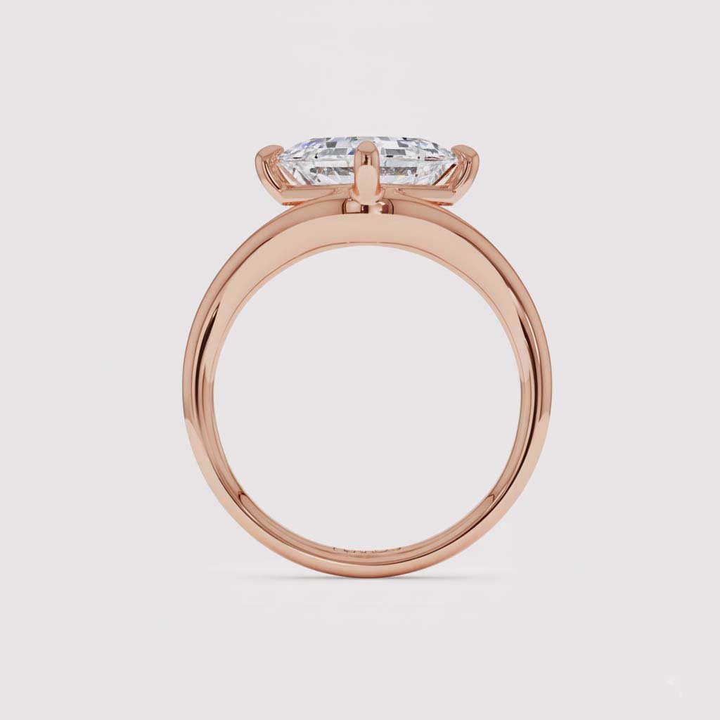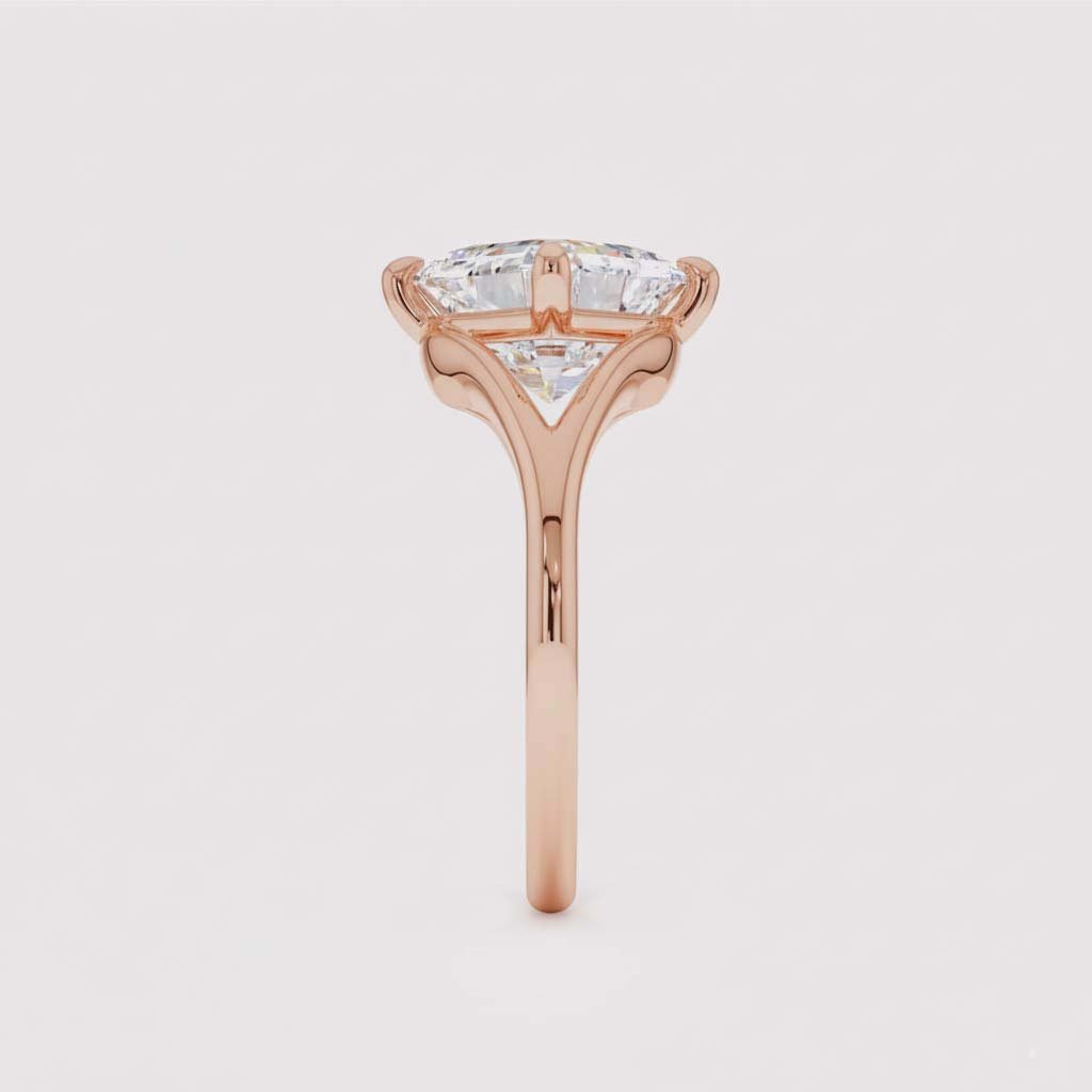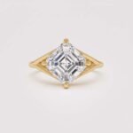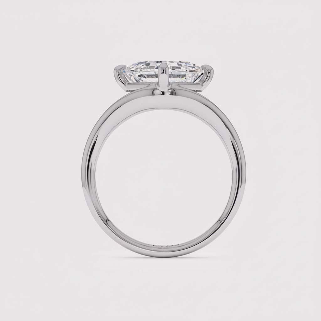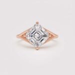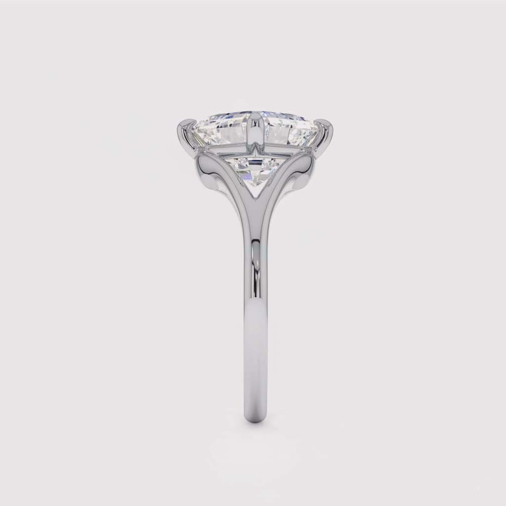 The stunning center stone is set in a “kite” orientation, turned 45 degrees to highlight its geometric, step-cut facets. The band features an elegant, tapered split shank that gracefully parts to support the open-gallery setting, allowing light to flood the diamond from every angle for unrivaled brilliance.