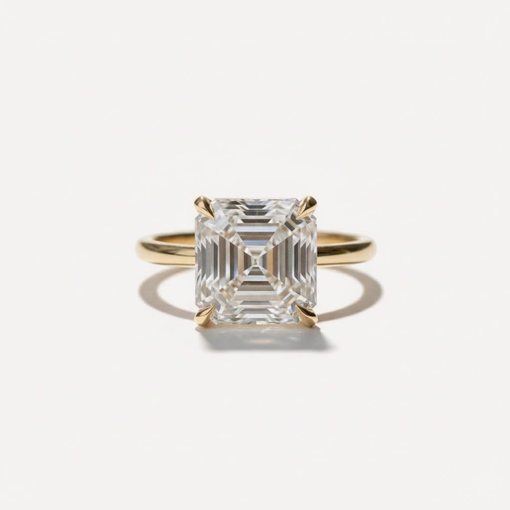 Make a bold and elegant statement with this 6.12 carat Asscher cut moissanite solitaire ring, designed for those who love timeless geometry and vintage luxury. The large step-cut center stone displays dramatic hall-of-mirrors brilliance, enhanced by its DE color and VVS1 clarity for exceptional fire and sparkle.