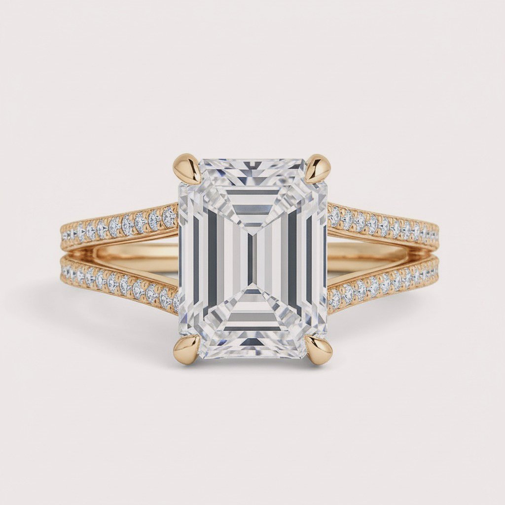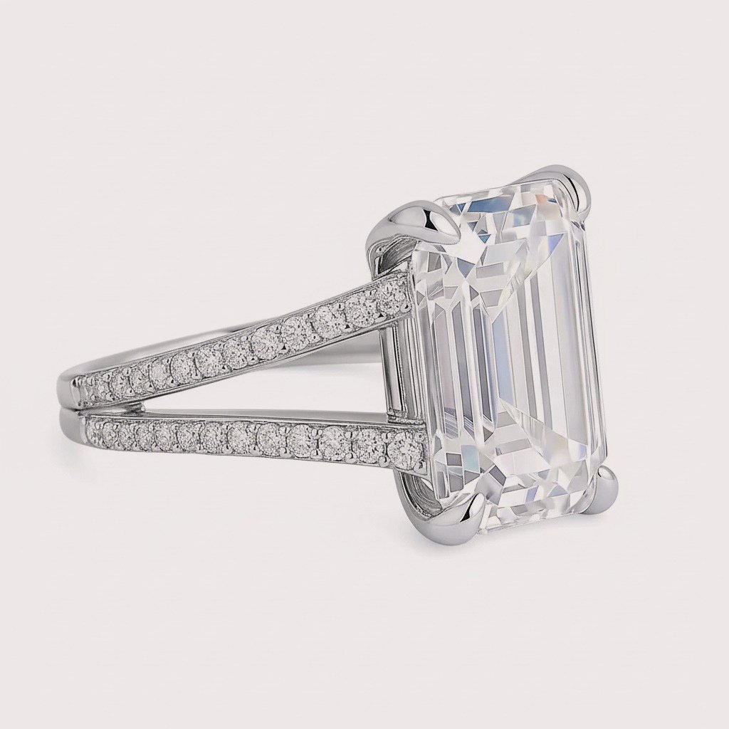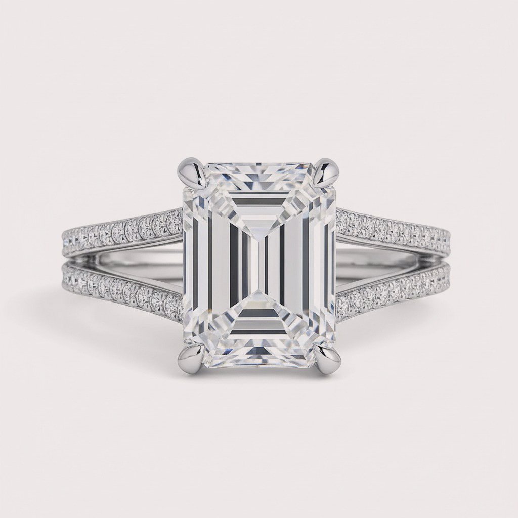 Beyoncé-inspired 3.00 carat emerald cut lab-grown diamond ring, designed for those who dare to shine like a queen. The flawless emerald cut center stone radiates timeless sophistication, while the split shank band, adorned with 0.38ctw round cut diamonds, adds a bold and glamorous finish — just like the one Beyoncé proudly wears.