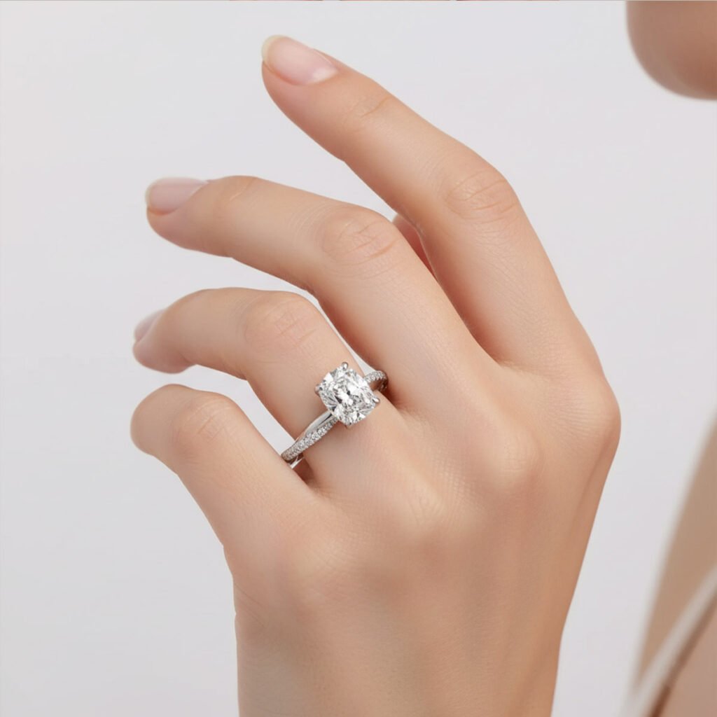Designed for those who adore cushion diamond rings, twisted pave engagement rings, and vintage-style engagement rings, this elegant piece is perfect as an anniversary gift, engagement ring, or Valentine’s Day surprise.