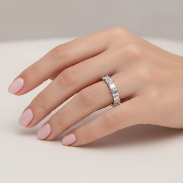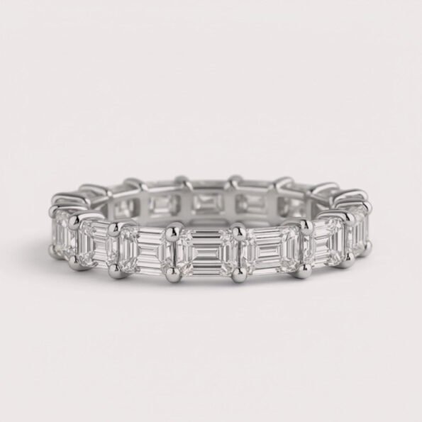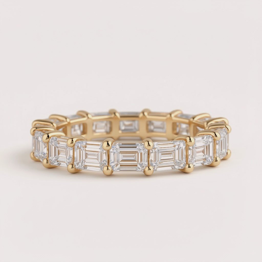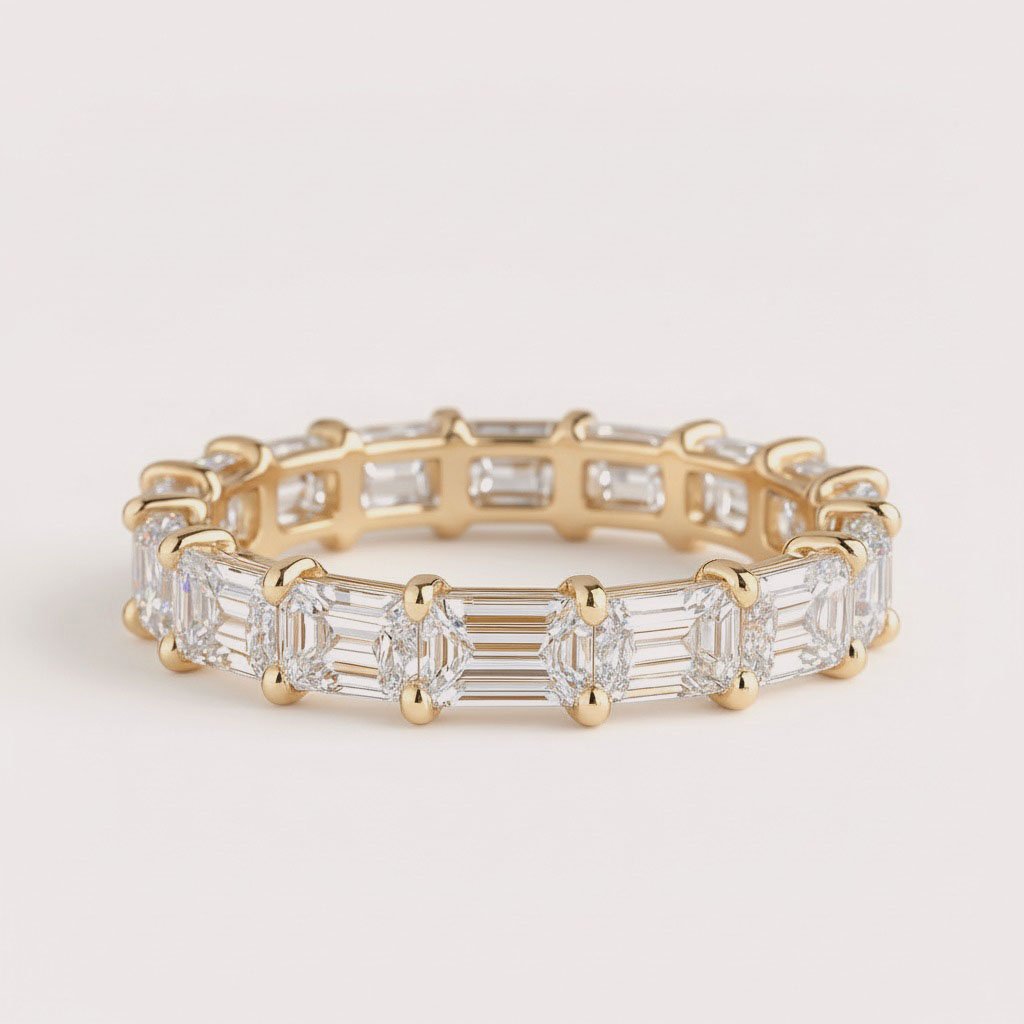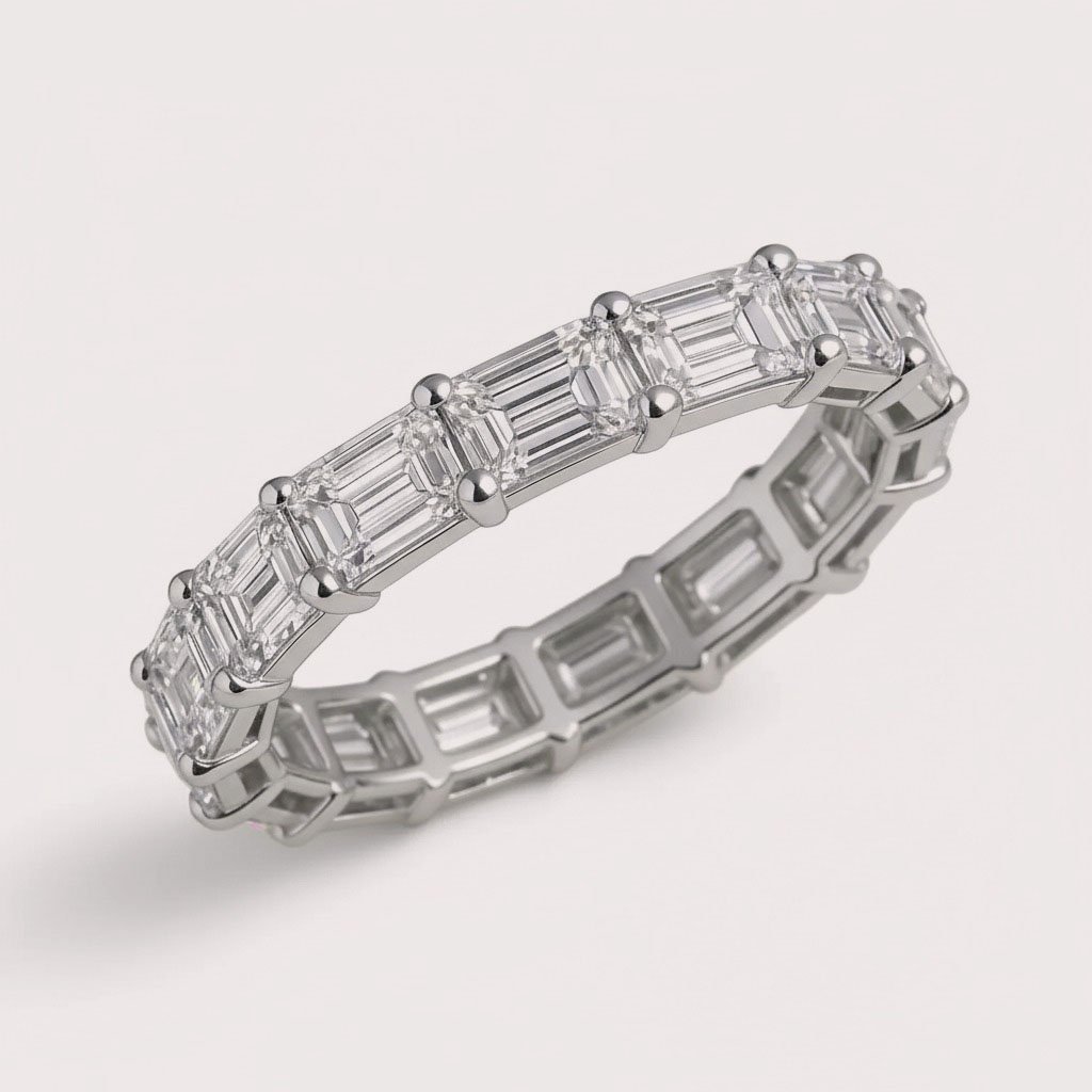 Discover the elegance of clean lines and symmetry with our East-West Set Emerald Cut Diamond Eternity Band. 💎 Featuring 4–7 carats of IGI certified CVD lab-grown diamonds, each emerald cut stone is precisely set in a sleek horizontal layout, offering a bold and modern take on the classic eternity ring.