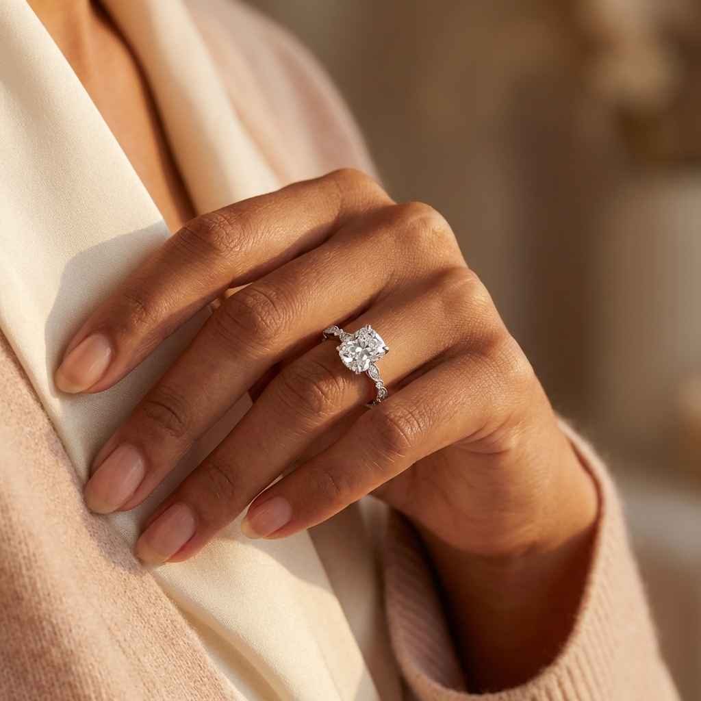 Celebrate timeless elegance with this 2.62 carat elongated cushion cut CVD lab-grown diamond ring, featuring an IGI-certified F color and VS1 clarity. Handset in 14K white gold, the side round diamonds add a luxurious sparkle to the classic design. A modern heirloom crafted for proposals, anniversaries, or meaningful celebrations, this ethically sourced diamond ring blends sophistication with conscious luxury. Ideal for brides who desire a high-carat look with eco-conscious values.