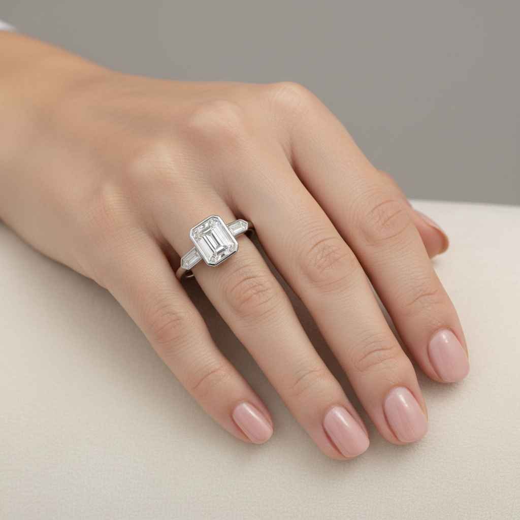 Make a timeless statement with this exquisite three-stone engagement ring, featuring a stunning 3.0ct emerald cut lab diamond, flanked by bullet-cut side stones totaling 0.55ctw. With an EF color grade and VS1 clarity, each stone is IGI certified and masterfully set in your choice of 10K, 14K, or 18K white, yellow, or rose gold. A perfect blend of vintage charm and modern brilliance.