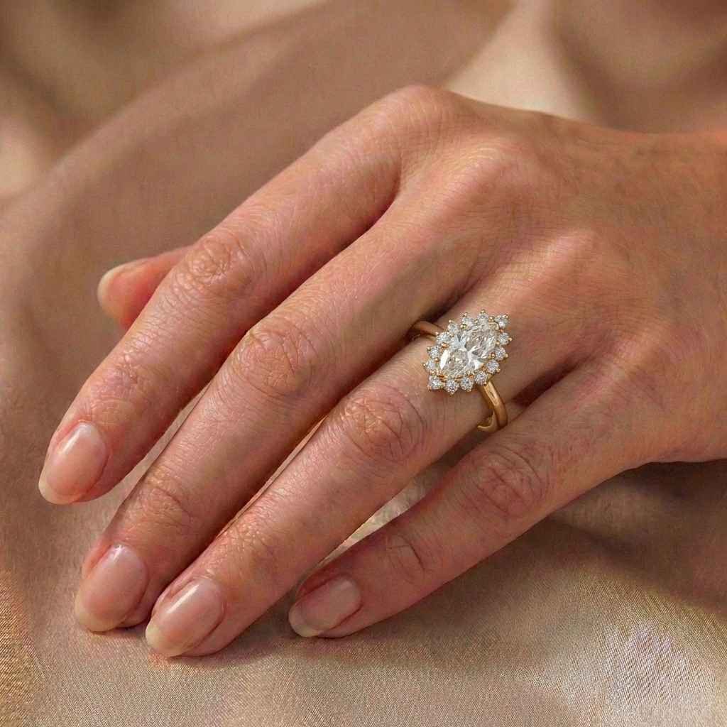 ✔ Brilliant Starburst Halo Setting: The Marquise Lab Diamond is set in a starburst halo design, enhancing its brilliance.