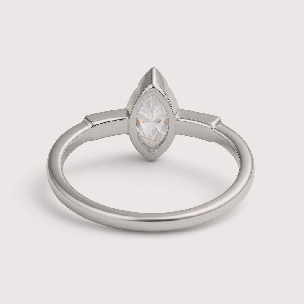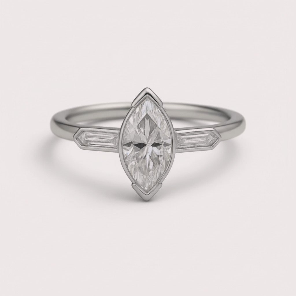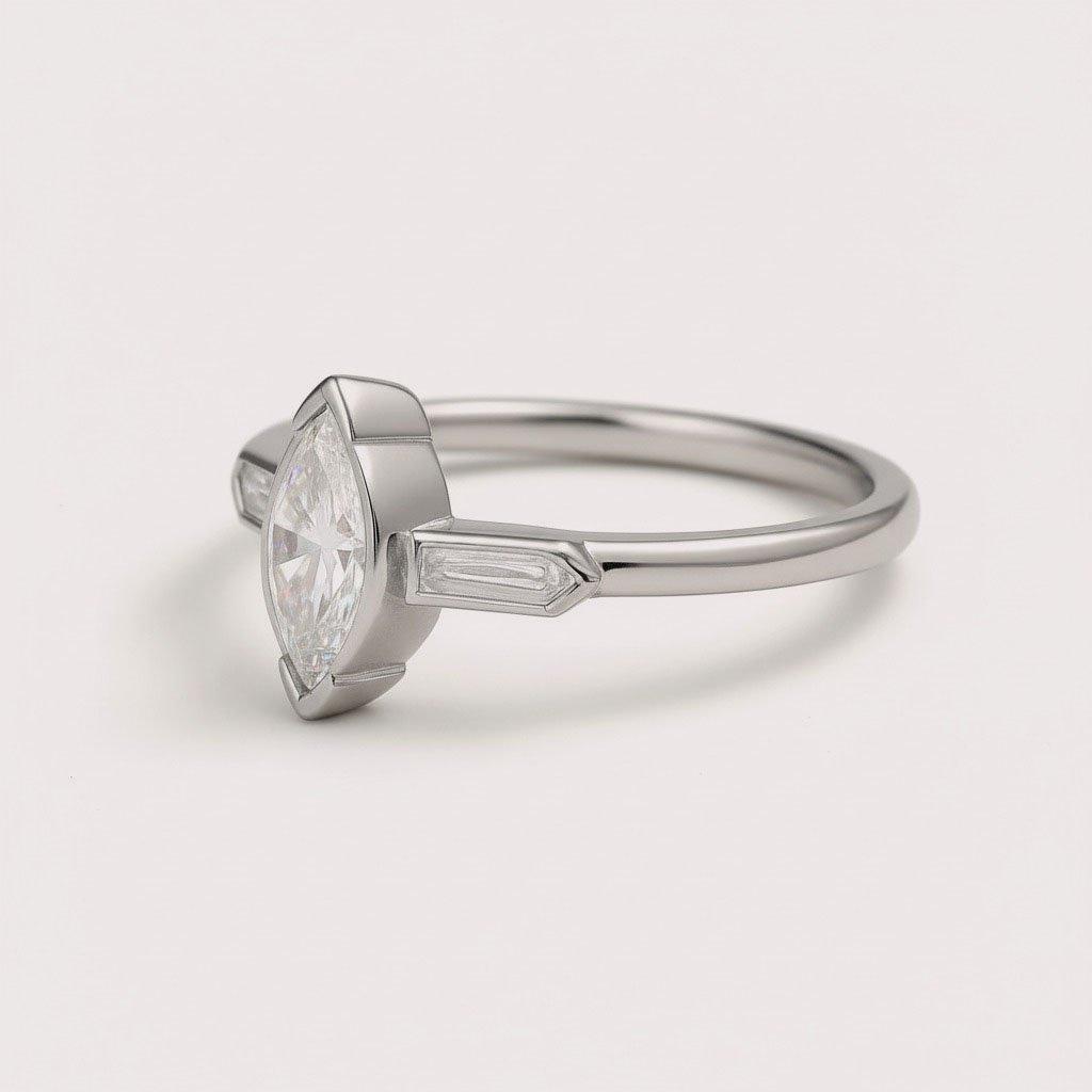 Gracefully designed for brilliance and balance, this three-stone lab diamond ring features a 1.60ct marquise cut center diamond and 0.38ctw bullet-cut side stones. With an EF color grade, VS1 clarity, and IGI certification, this unique silhouette shines with elegance. Available in 10K, 14K, or 18K white, rose, or yellow gold, this modern classic is ideal for those seeking sophistication with a distinctive edge.