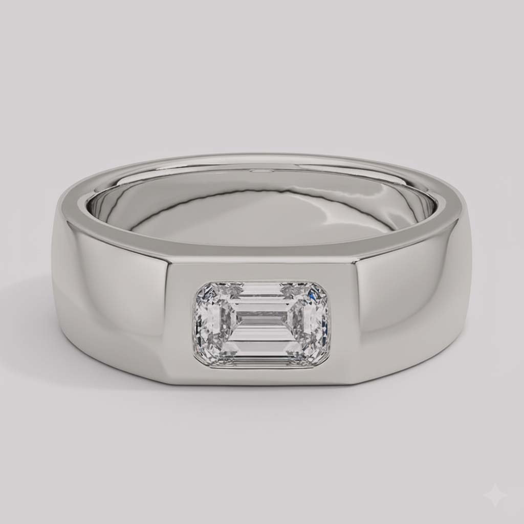 The diamond is set horizontally (east-west) in a secure flush “gypsy” setting, creating a sleek, powerful, and snag-free profile. This exceptional CVD diamond boasts an EF Color and VS1 Clarity, delivering the clear, bright flashes of a classic step-cut.