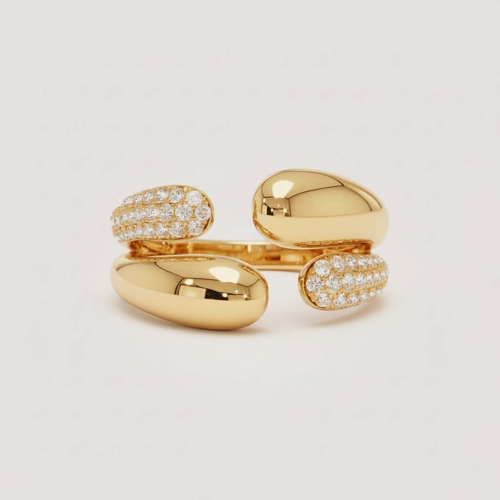 Make a bold, artistic statement with our Modern Sculptural Open Ring. This striking cocktail ring features a fluid, open-wrap design that splits into four distinct, organic “pebble” terminals.