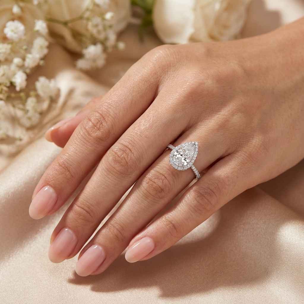 Pear Cut 1.5 Carat F/VS1 IGI Certified Lab Diamond Halo Engagement Ring in 14K White Gold – Side Round Diamonds, High Polish Finish