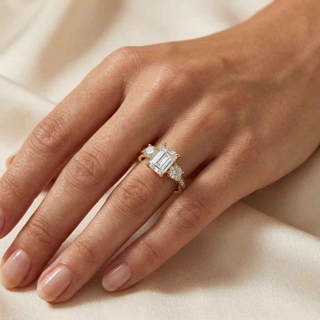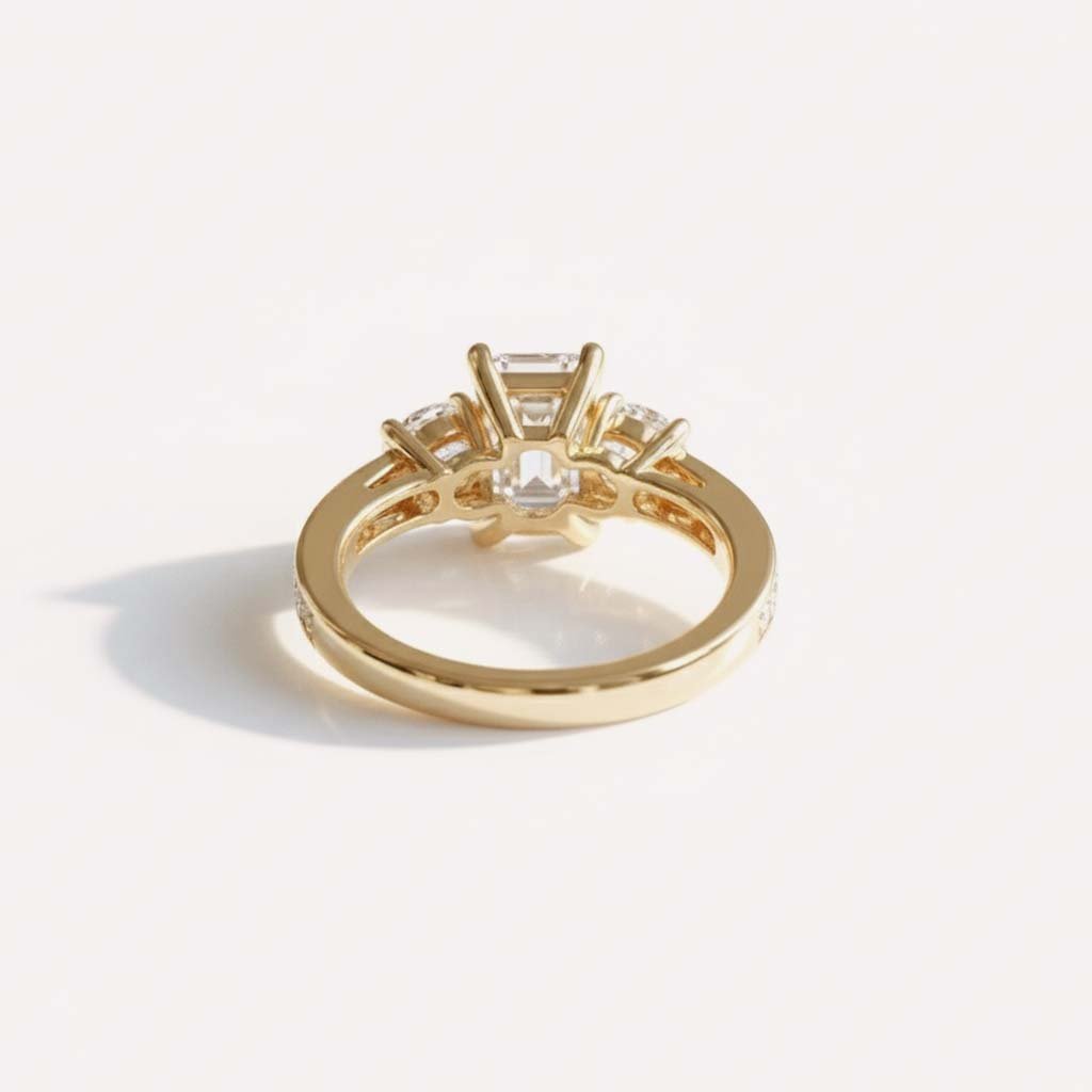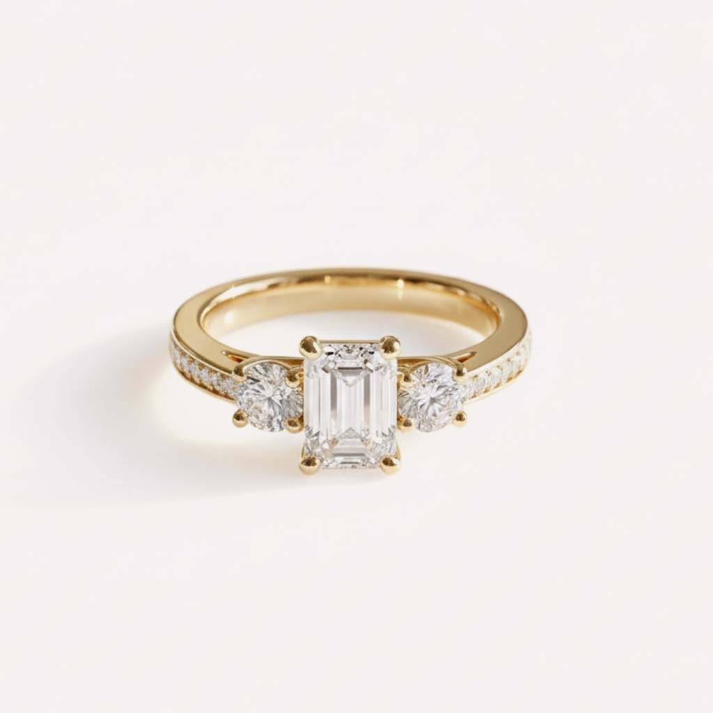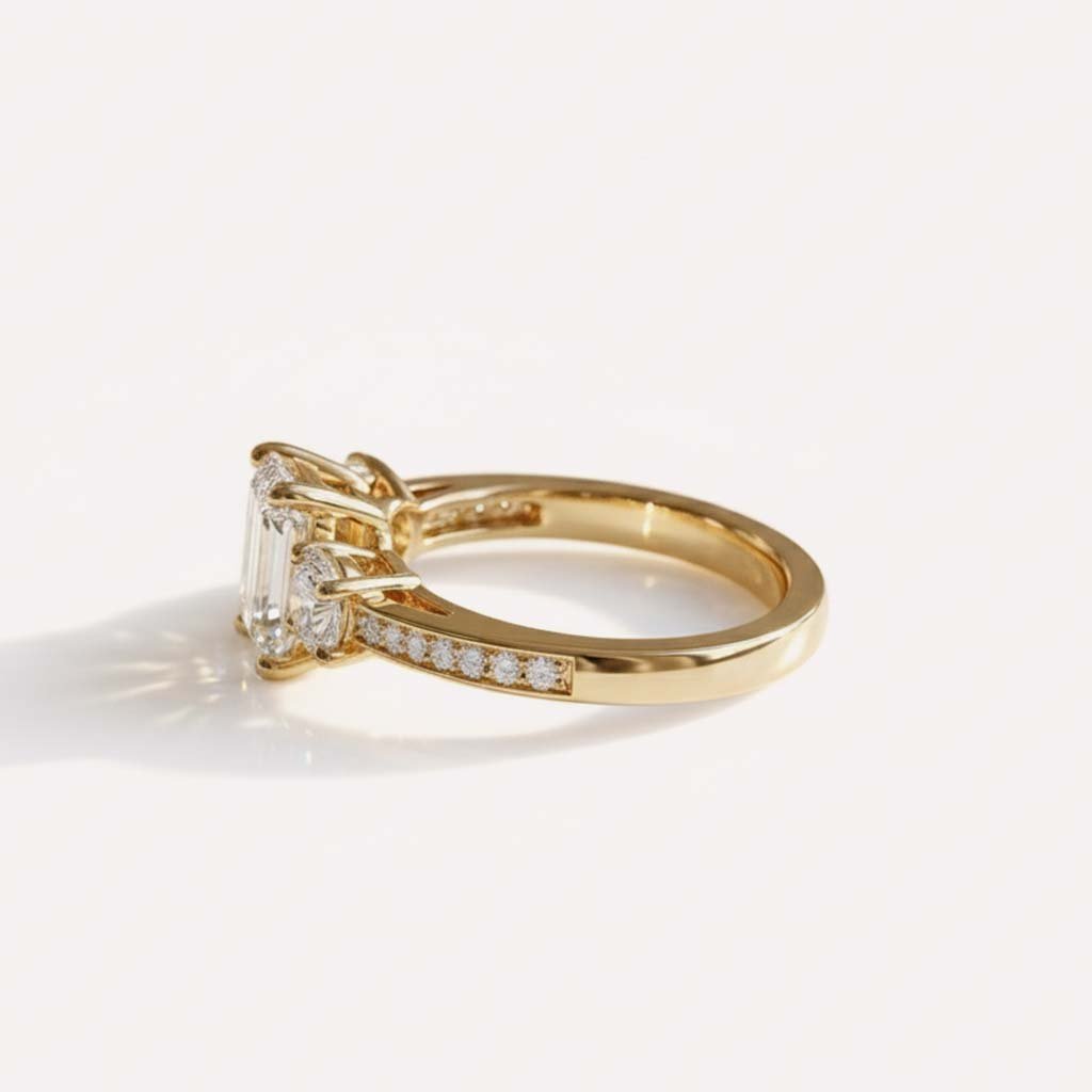 Celebrate your past, present, and future with this exquisite IGI Certified Three-Stone Engagement Ring. The centerpiece is a magnificent 1.75 ct (approx.) emerald-cut lab-grown diamond, renowned for its sophisticated step-cut facets and hall-of-mirrors effect.
