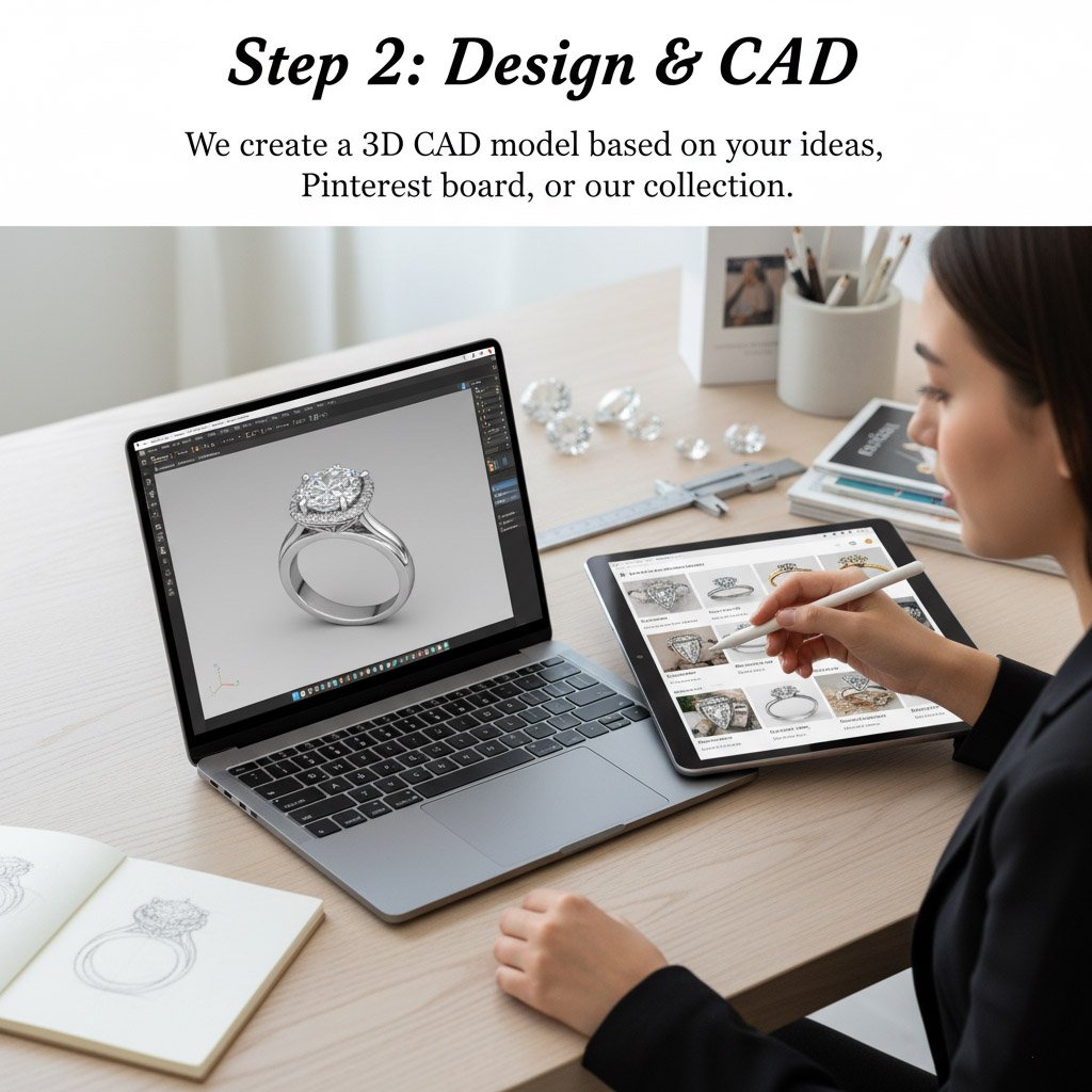 Step 2: Design & CAD We create a 3D CAD model based on your ideas, Pinterest board, or our collection.