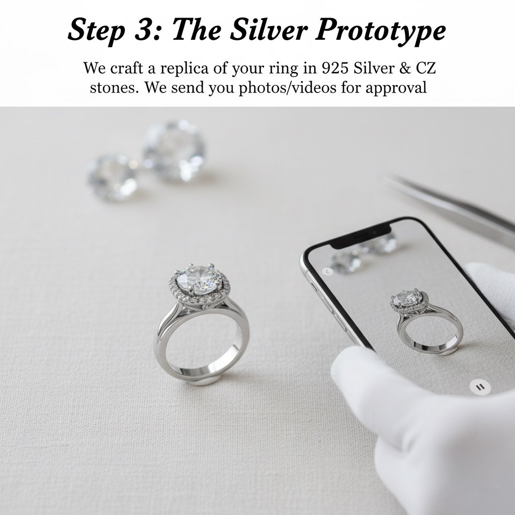 Step 3: The Silver Prototype We craft a replica of your ring in 925 Silver & CZ stones. We send you photos/videos for approval.