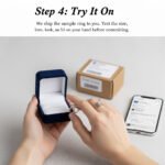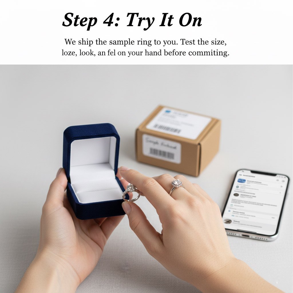 Step 4: Try It On We ship the sample ring to you. Test the size, look, and feel on your hand before committing.