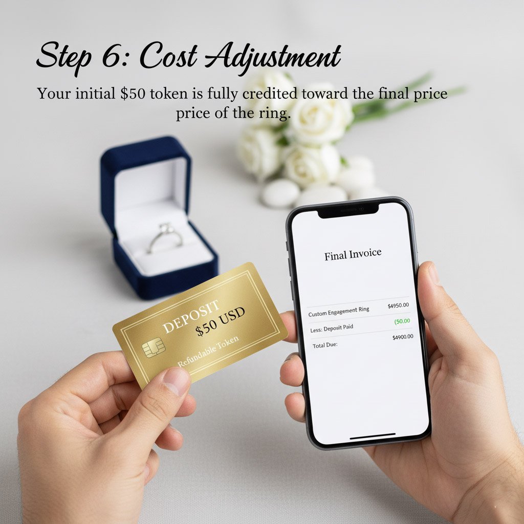 Step 6: Cost Adjustment Your initial $50 token is fully credited toward the final price of the ring.