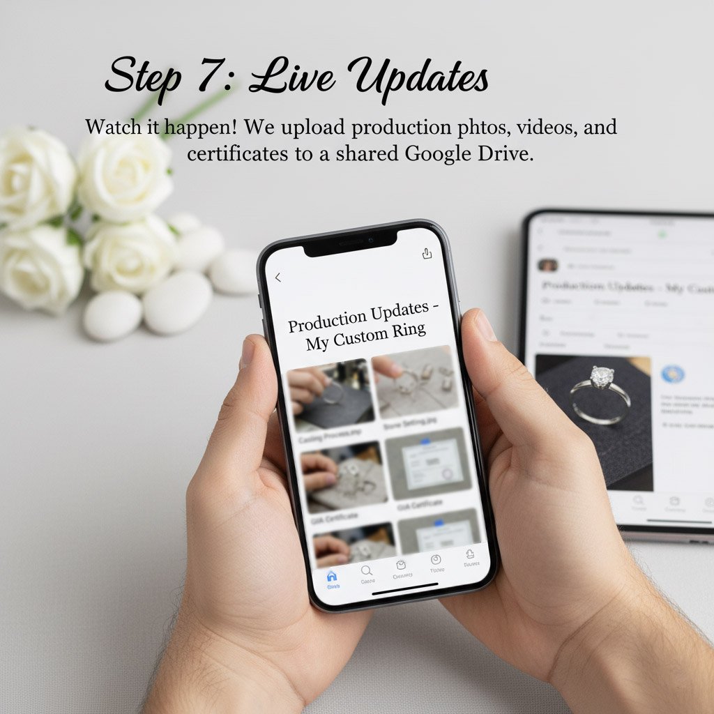 Step 7: Live Updates Watch it happen! We upload production photos, videos, and certificates to a shared Google Drive.