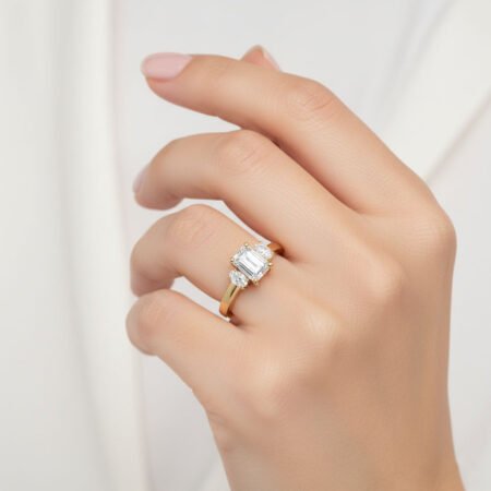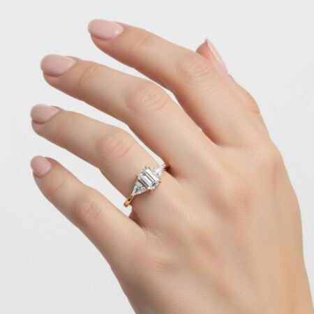 SKU: RE15931.52ct Emerald Cut Lab Grown Diamond Ring, IGI Certified, 2.25ctw Three Stone Trillion Setting, EF/VS1 CVD, 14K Gold Engagement Ring